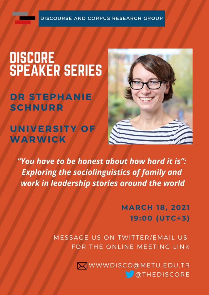 DISCORE Speaker Series continues with Dr. Stephanie Schnurr from the University of Warwick. Dr. Schnurr will deliver her talk titled "You have to be honest about how hard it is": Exploring the sociolinguistics of family and work in leadership stories around the world. The session will be held on March 18, 2021 (Thursday) via Zoom at 19.00 pm.